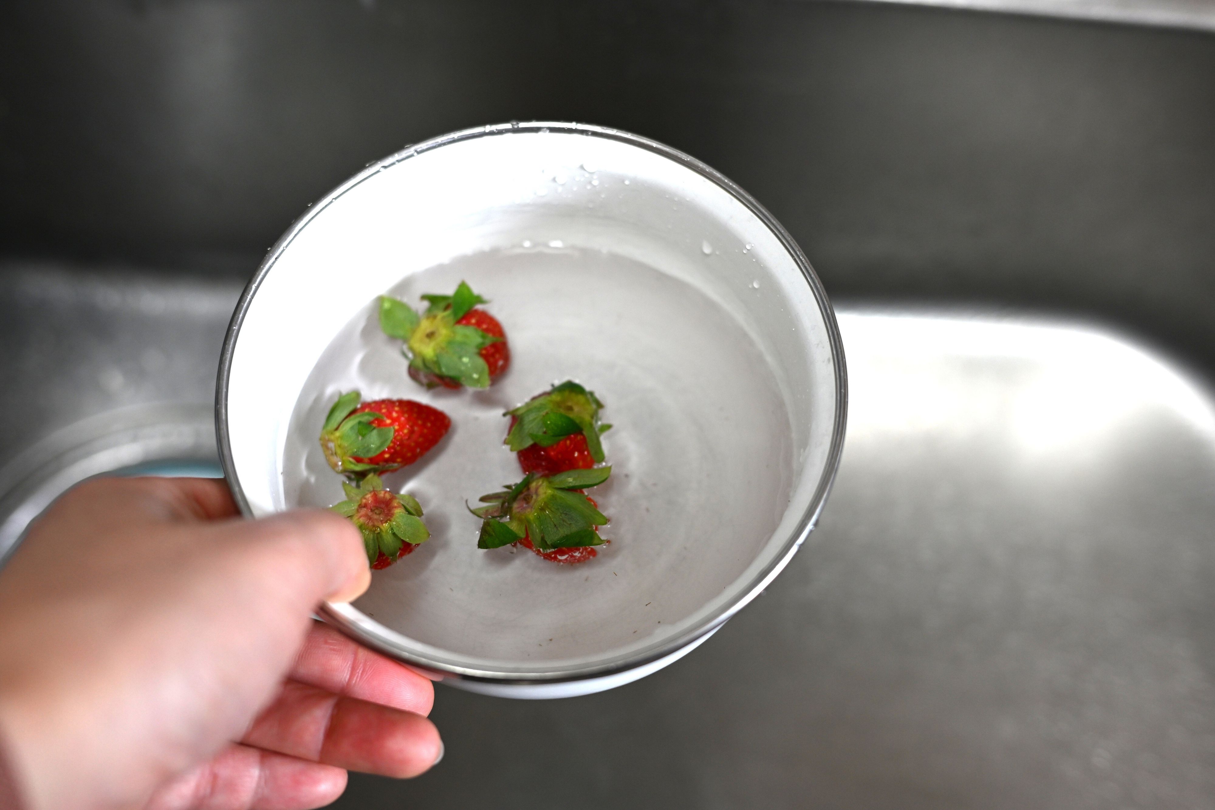 洗い終えた直後の見た目は、そこまで違いを感じませんでしたが、若干ヘタを取ったいちごのヘタを取った部分が水っぽいというか、ふやけた感じがあるようにも見えます。