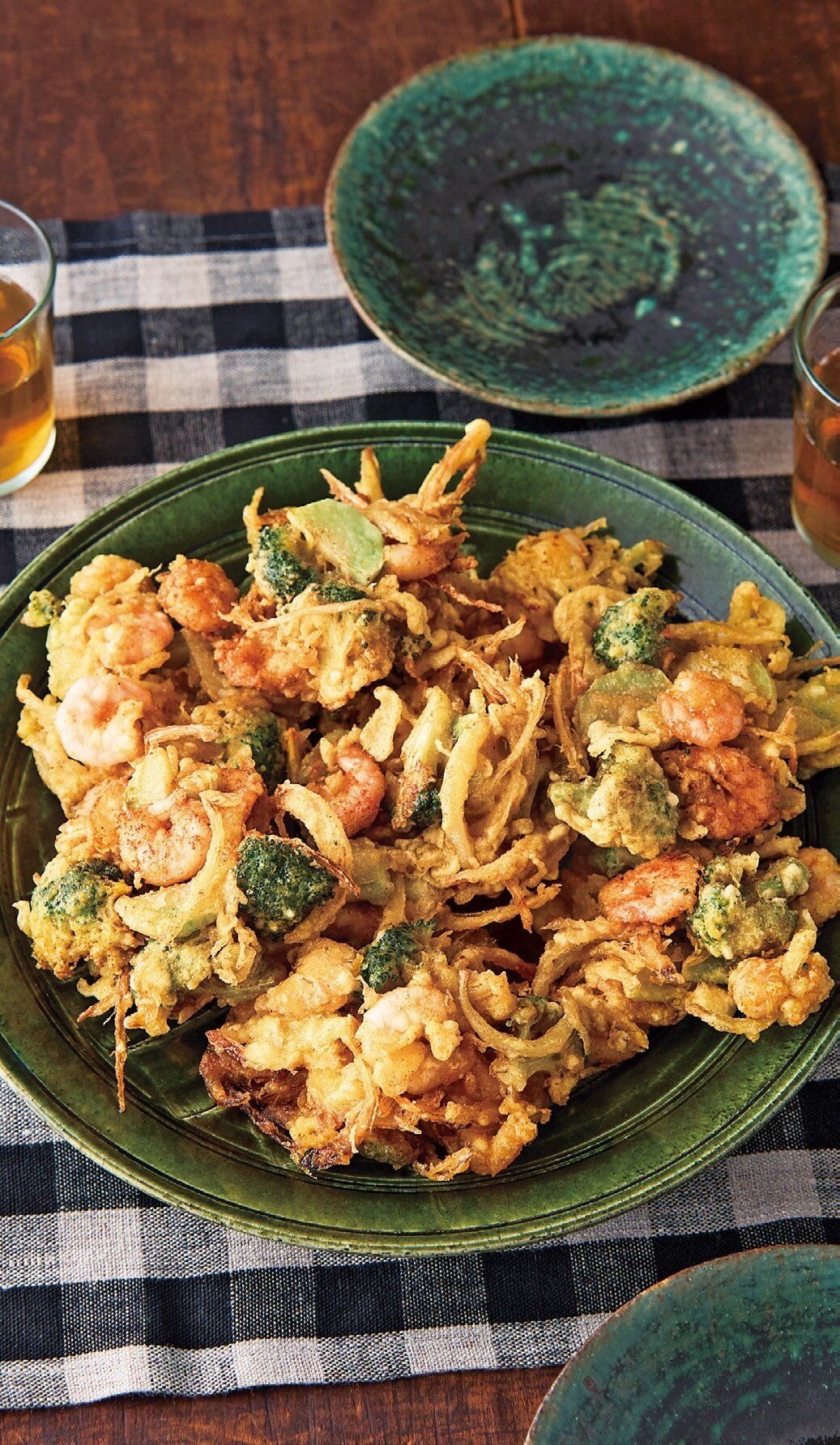 ブロッコリーは小さめの小房に分け、茎は皮を厚めにむいて厚さ5mmの半月切りにする。玉ねぎは縦に薄切りにする。むきえびはあれば背わたを取って洗う。すべてをボウルに入れ、薄力粉、カレー粉をふり入れてざっくりと混ぜる。