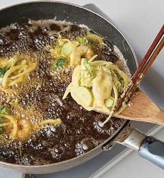 1/8量のたねを木べらですくい、箸ですべらせて油に入れる。4個ずつ、2回に分けて揚げる。