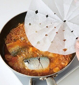 煮汁が対流して均一に火が通るように落としぶたをして煮る。落としぶたは、煮汁全体にかぶせられるようにフライパンと同じ大きさに切ったオーブンシートに穴をあけるとよい。