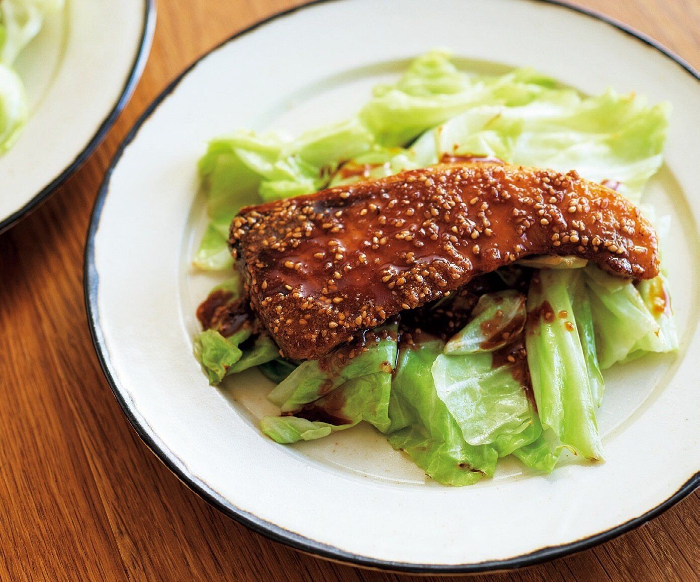 (1)フライパンにサラダ油大さじ1/2を強めの中火で熱し、キャベツ半量をしんなりするまで約2分炒めて器に広げて盛る。残りのキャベツも同様に炒める。