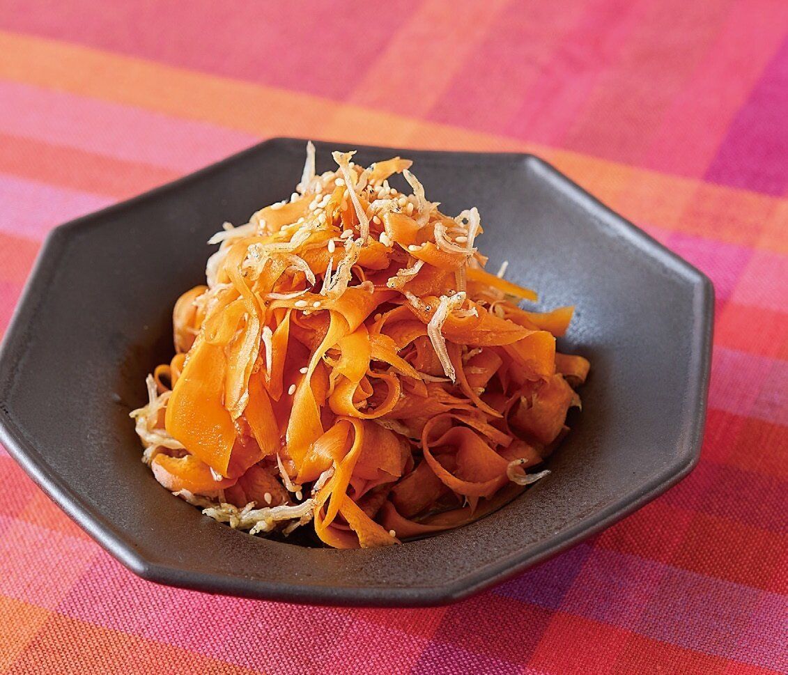 にんじんはピーラーで薄切りにする。耐熱ボウルに[A]、ちりめんじゃこ、にんじんを入れて混ぜ、ラップを掛けて電子レンジで2分加熱する。