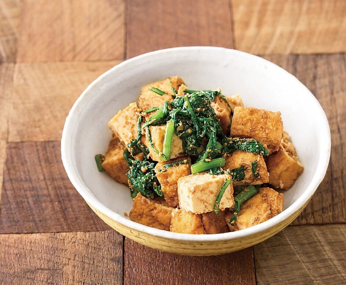 厚揚げは2cm角に切る。沸騰した湯に厚揚げと春菊を入れ、再度煮立ったら、ざるに上げる。水けを拭き、春菊は長さ2cmに切る。大きめのボウルに[A]を混ぜ合わせ、厚揚げ、春菊を加えてあえる。