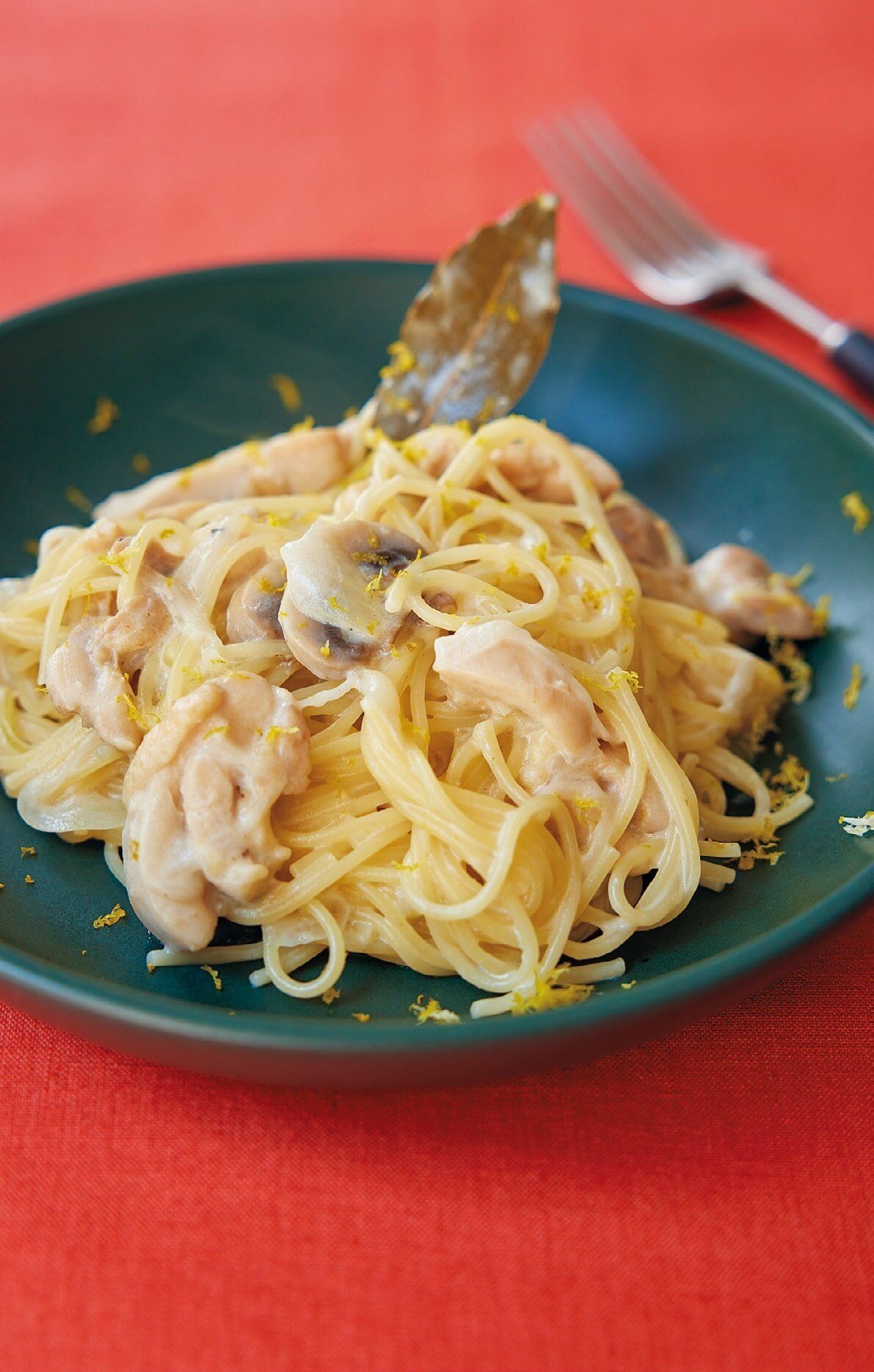 (2)鶏肉に火が通ったら[B]を加え、沸騰したらスパゲティを半分に折って加える。時々混ぜながら7~8分煮て、水けがなくなってきたら粉チーズを加えて混ぜ、器に盛る。ゆずの皮を散らし、絞り汁をふる。