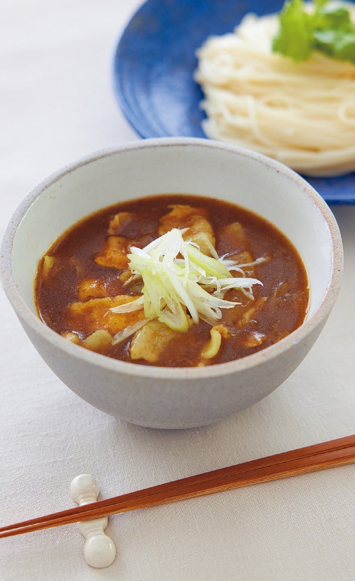 (3)うどんは袋の表示どおりゆでて冷水でしめ、水けをきって器に盛り、三つ葉をのせる。別の深みのある器に(2)を盛り、取りおいたねぎをのせてうどんに添える。