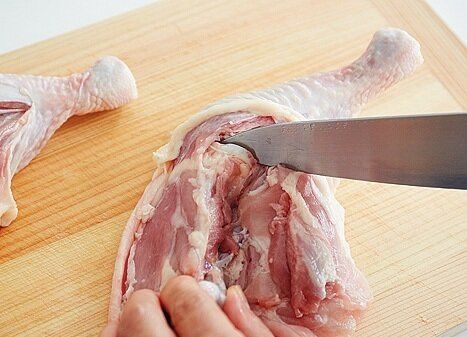 まな板に鶏肉の皮目を下にして置き、骨にそってくの字に切り込みを入れる。骨の関節部分にある軟骨(白い部分)に切り込みを入れる。[A]を肉全体にすり込んで1時間ほどおく。