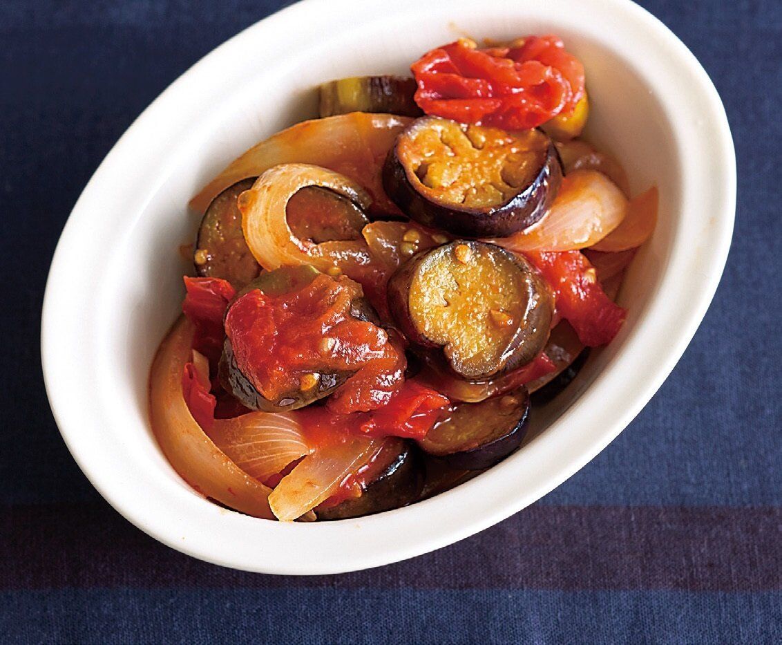 フライパンになす、玉ねぎ、にんにく、オリーブ油を入れ、中火で約5分炒め、しんなりしたらトマト、[A]を加えて、中火のまま約8分、ときどき混ぜながら煮る。