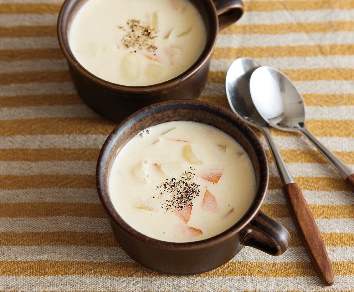 玉ねぎは1cm四方に切り、にんじんは薄いいちょう切りにする。鍋にバターを入れて中火にかけ、玉ねぎとにんじんを炒める。しんなりしたら[A]を加え、ふたをして中火のまま約10分煮る。牛乳を加え、煮立つ直前に水溶き片栗粉を加え、とろみをつける。器に盛り、黒こしょうをふる。