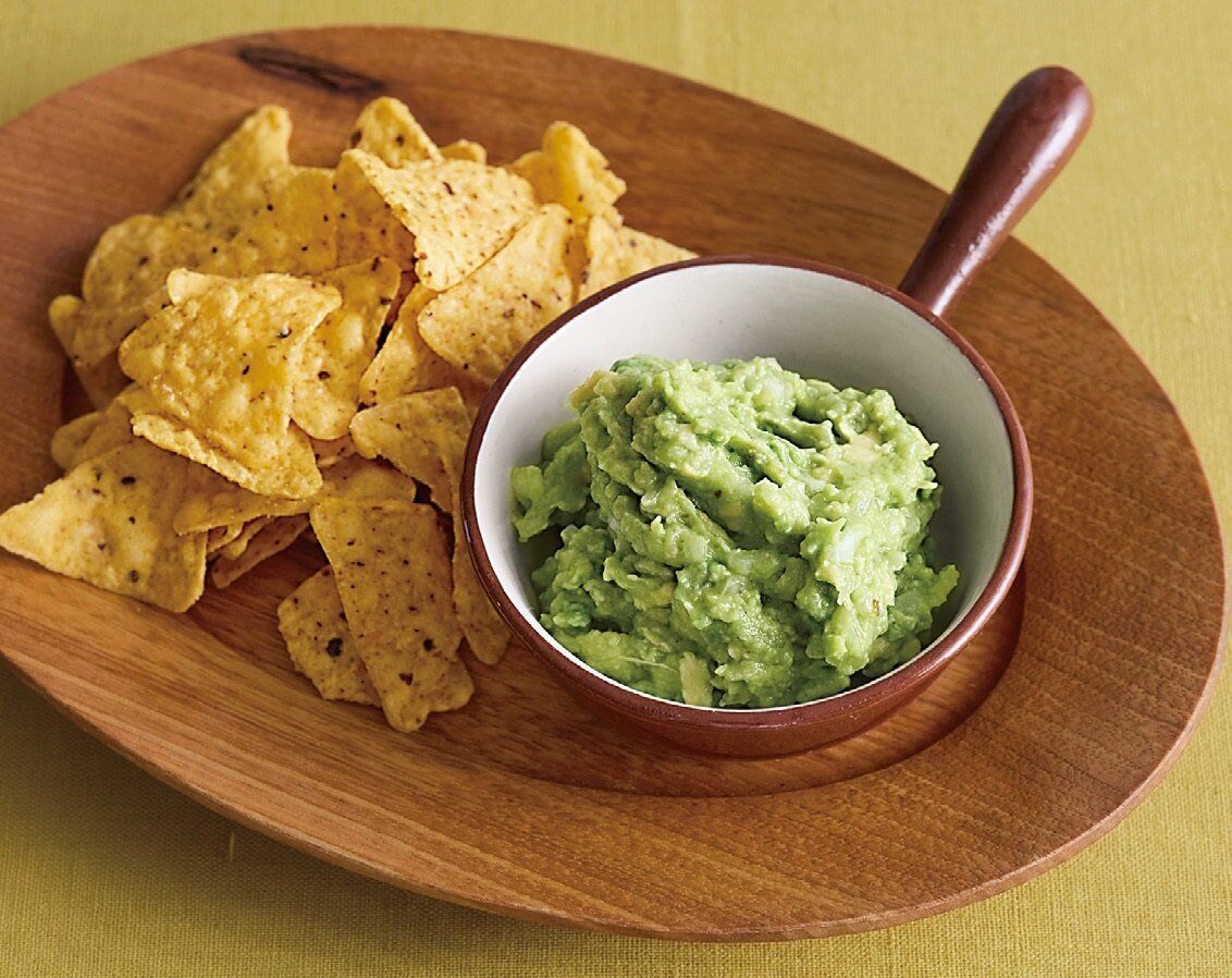 アボカドは皮と種を除き、ボウルに入れてフォークでつぶす。[A]を加えてよく混ぜる。器に盛り、トルティーヤチップスを添える。