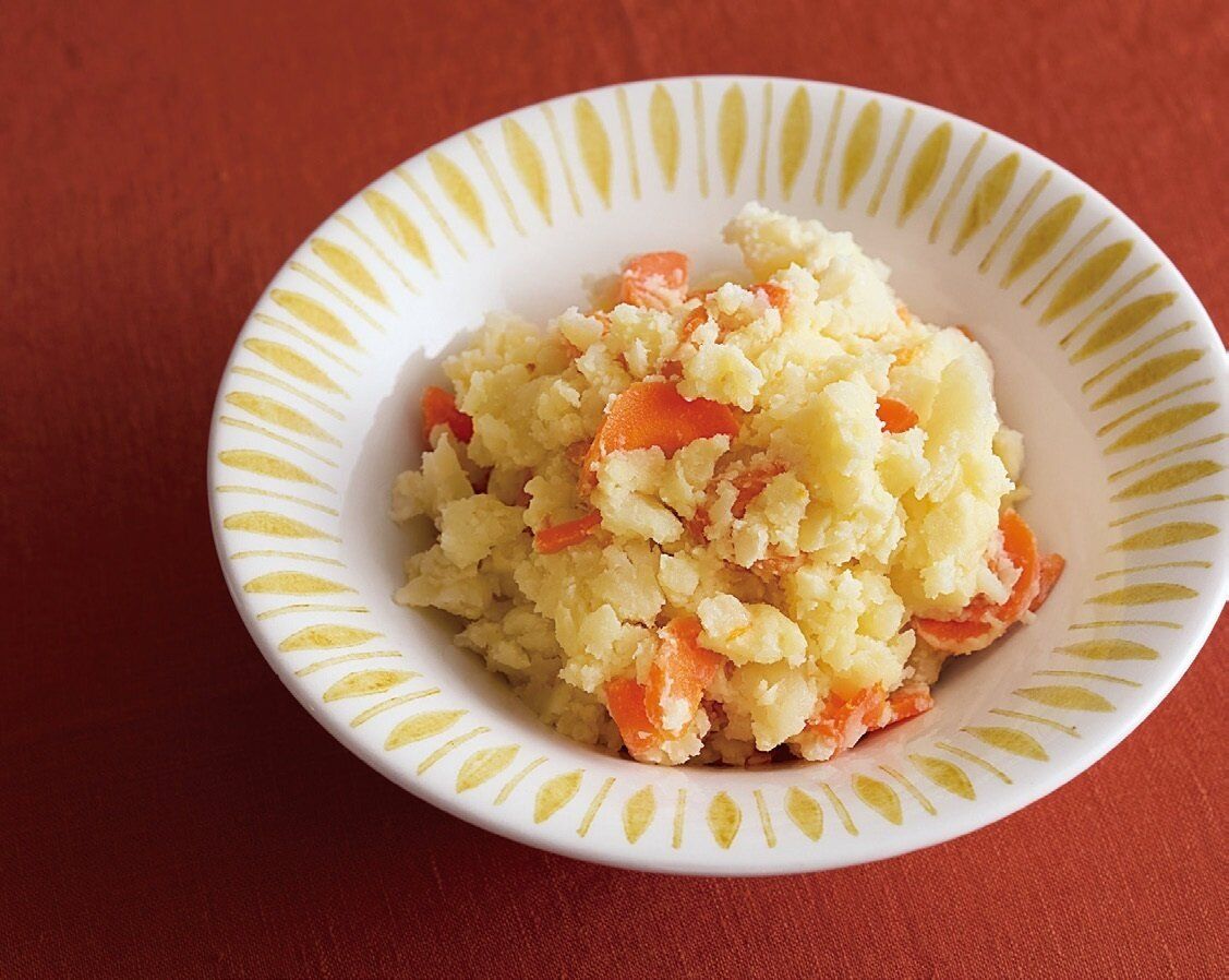 じゃがいもは1個を8等分に切って水にさっとさらす。にんじんは薄い半月切りにする。耐熱皿にじゃがいもとにんじんをのせてラップをふんわりと掛け、電子レンジで5分加熱する。レンジにそのまま5分おいてからボウルに移し、フォークでざっくりつぶす。[A]を加えて混ぜる。