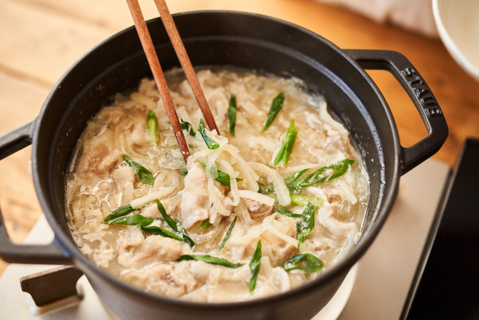 だし汁に塩麹を加えた汁に、豚肉や豆苗などと一緒に煮込むだけでつくれますよ。