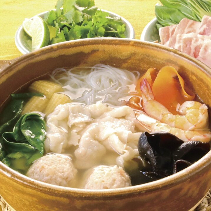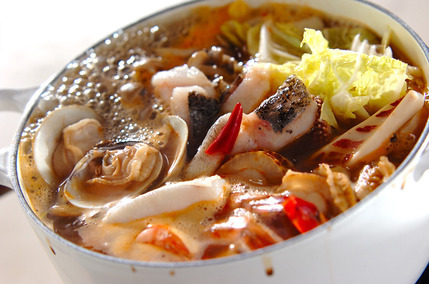 エビやタラなどの魚介をメインに、しょうゆベースのスープで煮込み、タイ料理のトムヤムクンを思わせる辛みと酸味のあるタレを加える鍋レシピです。