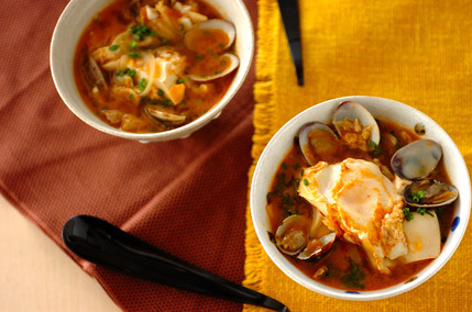 コチュジャンやキムチなどで辛みを加え、豆腐以外にもあさりなどのうま味のある食材を加えて具だくさんに仕上げるのが特徴。ごはんにもよく合うので、定食スタイルで取り入れるのもいいですね。