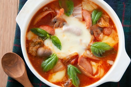 トマトやウィンナーソーセージ、溶けるチーズを組み合わせたピザのような鍋レシピです。