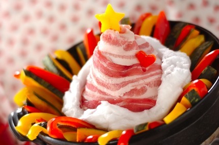 トマトジュース、コンソメ、白ワインをベースにしたスープに、肉や野菜とともに、カマンベールチーズを豪快にのせた色鮮やかな鍋レシピです。