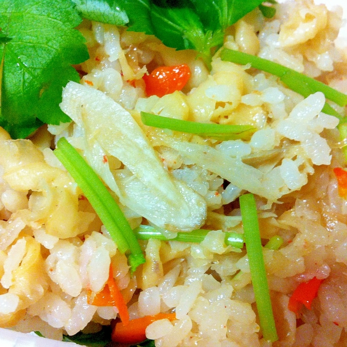 カニ缶にホタテ缶を組み合わせた、うまみぎっしりのおこわレシピです。