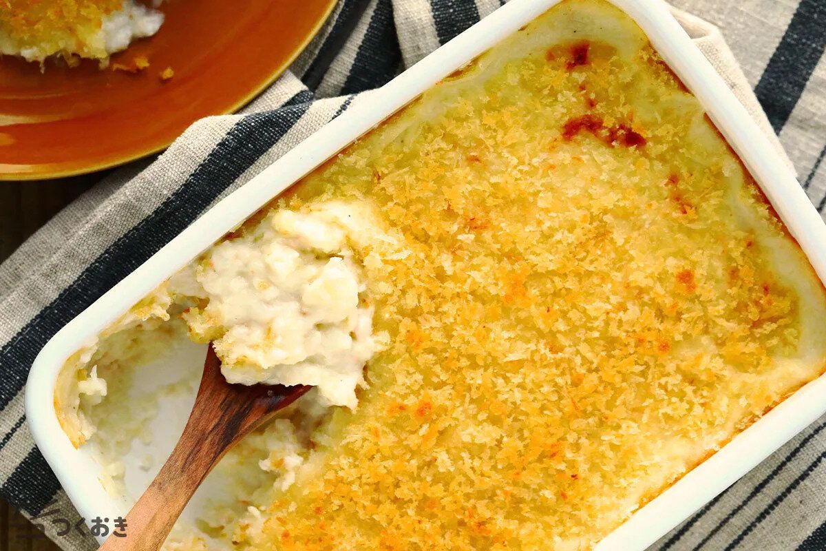 揚げたり、丸めて形を整える工程が不要の、オーブンで焼いてすくって食べるコロッケレシピになっています。