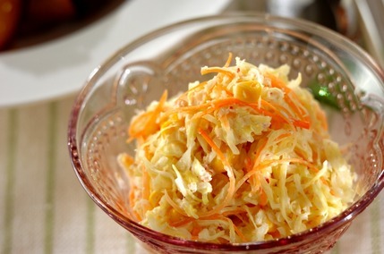 キャベツ、にんじん、コーンのコールスローサラダにカニ缶を加える、短時間でつくれるお手軽レシピです。