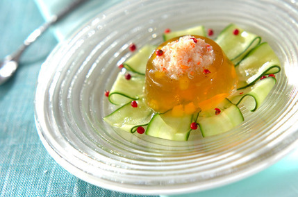 ゼラチンを使ってカニ缶入りのコンソメスープを固めた、涼やかな見た目の一品。