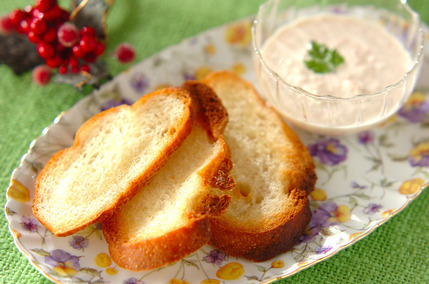 にんにくとオリーブオイルを塗ってカリッと焼いたフランスパンに、カニマヨをディップして食べる一品です。