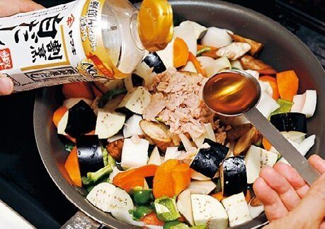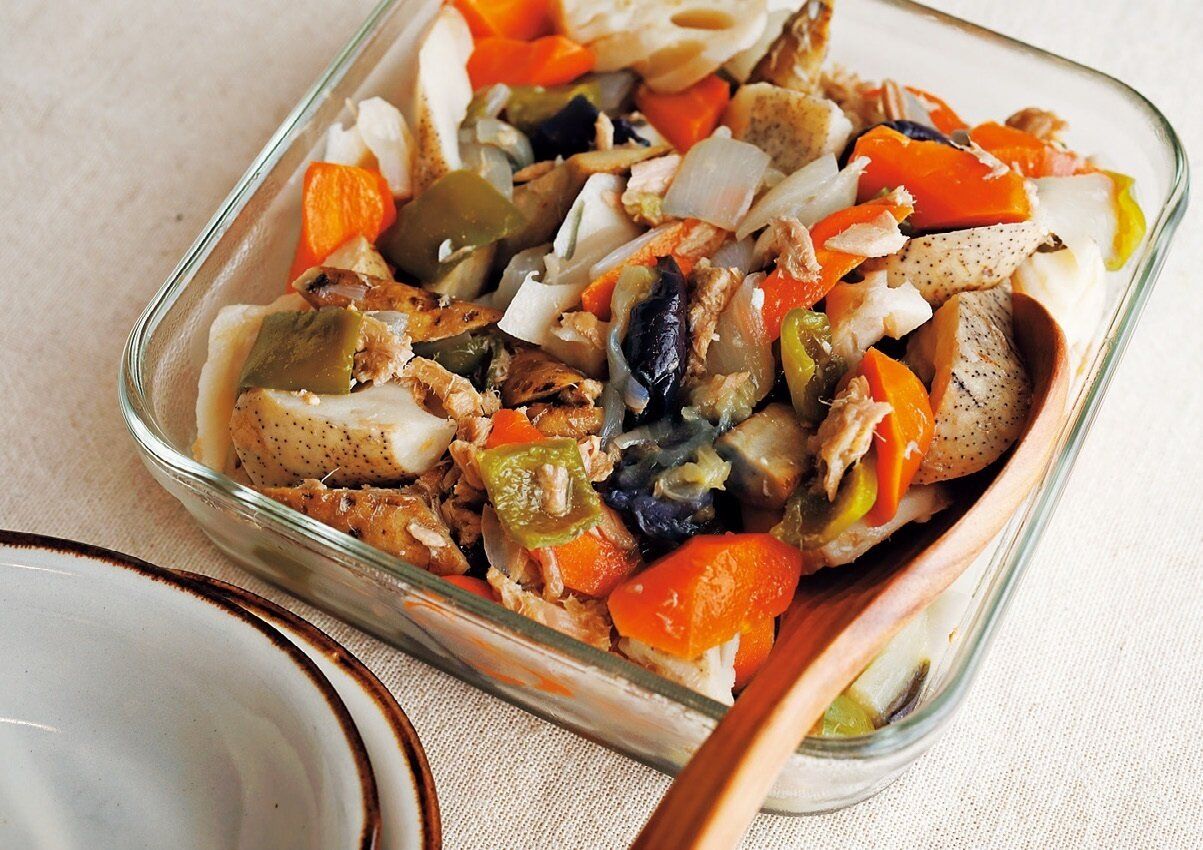 半端野菜合計500gくらい(写真は、玉ねぎ1/2個、ピーマン2個、なす1個、にんじん1本、ごぼう1本、れんこん200g)は食べやすい大きさに切る。フライパンに野菜を入れ、ツナ缶1缶(汁ごと)、白だし大さじ2~3、好みでおろしにんにく(チューブ)2cmを加える。中火で熱して全体をよく混ぜ、ふたをして10分煮る。味がたりなければ、塩少々を加える。
