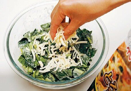 チーズを多めに入れることでおいしいこくやモチモチ感、焼けたときの香ばしさがUP。「小松菜特有の青臭さやえぐみをやわらげてくれる効果もあるねん!」。