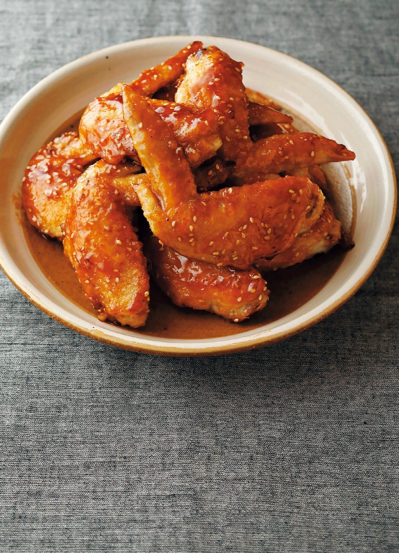 フライパンに片栗粉大さじ4をまぶした鶏手羽先12本を並べ、サラダ油大さじ5を回しかけて強めの中火で4分、裏返して2~3分焼き、いったん取り出す。余分な油を拭いたフライパンに、めんつゆ(2倍濃縮)大さじ2、焼き肉のたれ大さじ4を入れて熱し、1~2分煮つめて火を止め、鶏肉、いりごま適量を加えてよくからめる。