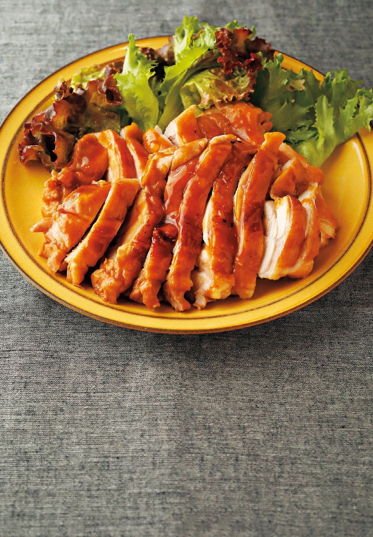 鶏もも肉2枚(700g)は皮をのばし、皮目を下にしてフライパンに入れ、酒大さじ4、焼き肉のたれ大さじ4、めんつゆ(2倍濃縮)大さじ2をかけてふたをし、中火で8分蒸し焼きにする。裏返してふたをし、5分たったら、火を止めて粗熱を取り、薄いそぎ切りにする。好みに煮つめたたれをかける。