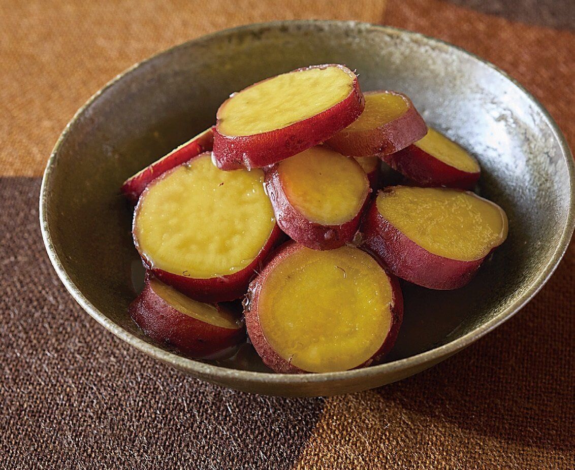さつまいもは皮つきのまま厚さ1cmの輪切りにし、さっと水にさらして水けをきる。鍋に[A]を混ぜ、さつまいもを入れて強火にかけ、煮立ったらふたをして弱火で約15分煮る。ざっくりと混ぜ、さましながら味を含ませる。食べる際にもう一度温める。