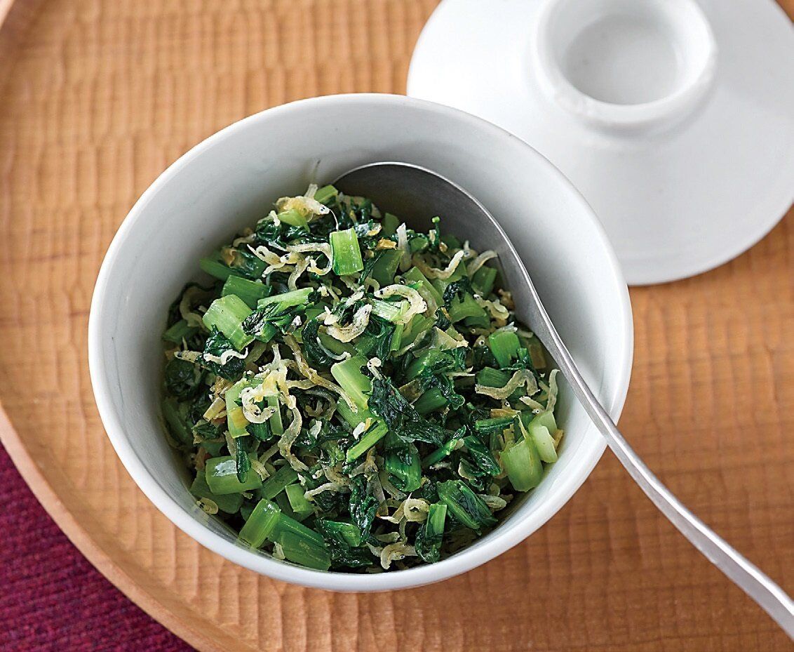 小松菜は葉を縦に幅1cmに細く切ってから、端から長さ1cmに切る。フライパンに油を中火で熱し、じゃこを入れて炒める。薄く色づいてきたら小松菜を加え、しんなりするまで約2分炒める。[A]を加え、炒め合わせる。