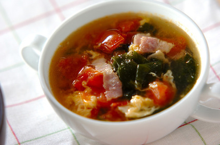 トマト、卵、わかめ、ベーコンなどを加えてつくる、中華風のスープです。トマトが入ることで、彩りが良く、さっぱりとした味わいを楽しむことができますよ。
