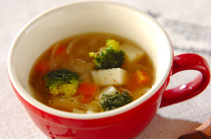 コンソメや塩こしょうで味を調えた洋風スープに、レモン汁を加えたさっぱりとした味わいの一品です。ブロッコリー、玉ねぎ、にんじん、じゃがいもといった何種類もの野菜をゴロゴロと入れてつくるので、素材のうま味や甘味などで満足度の高い味わいが楽しめます。