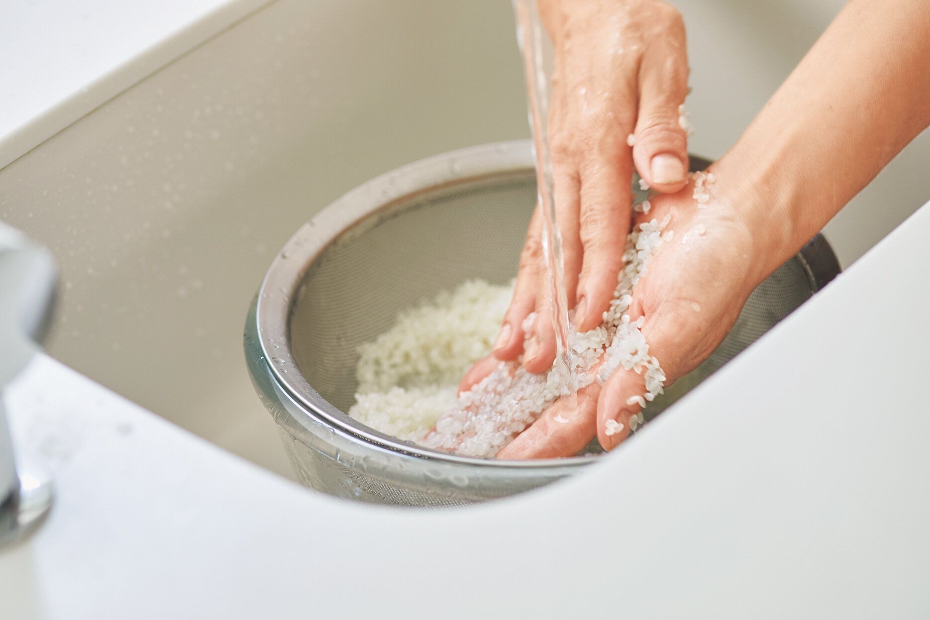 米はボウルに重ねたざるに入れて水をたっぷり加え、すぐに捨ててなでるようにやさしくとぎます。精米の歩合を高めた大吟醸酒のように、米を丁寧に磨くイメージで5~6回くり返します。