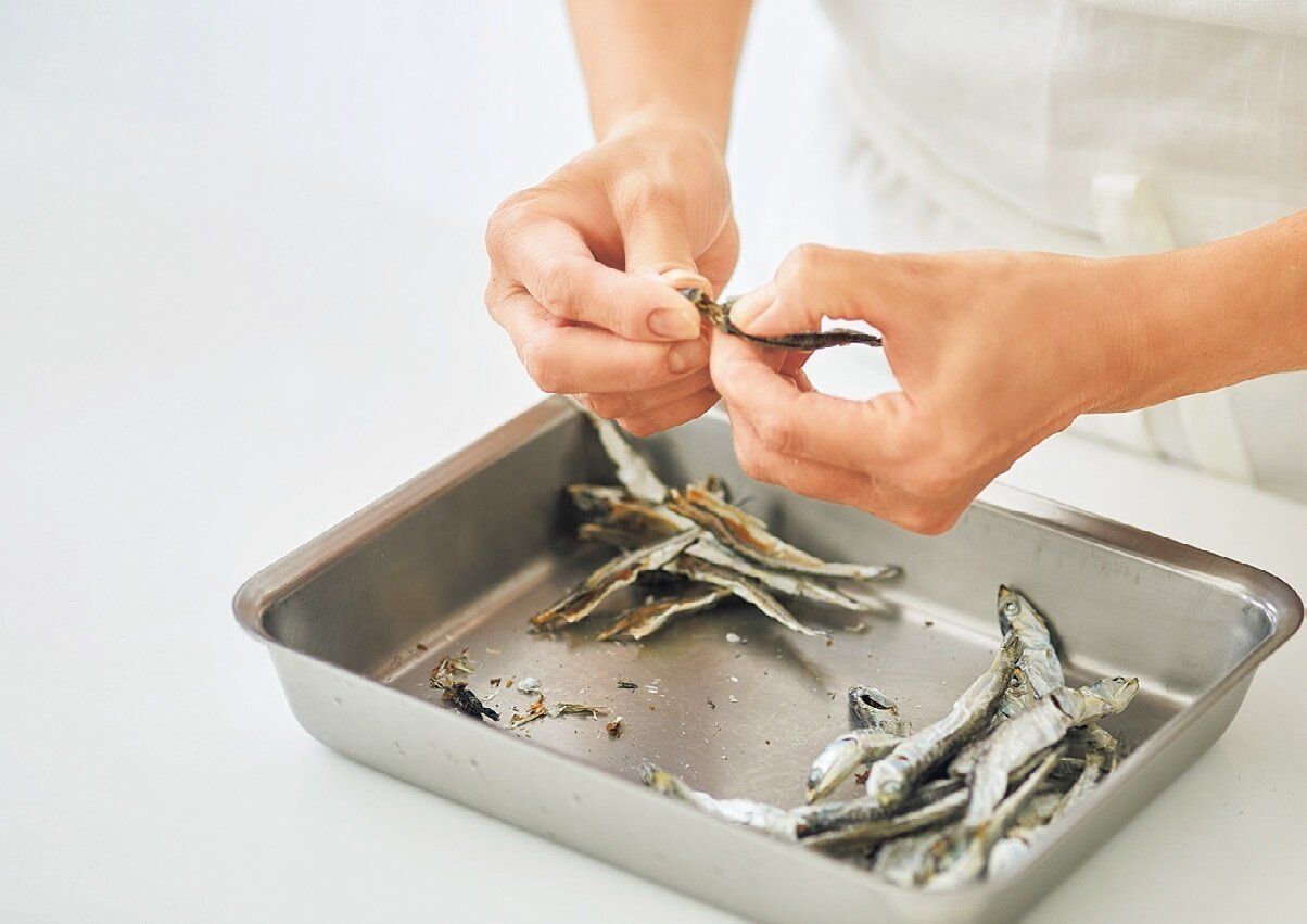 だし汁はお好みのものでいいですが、煮干しと昆布でしっかり濃いめにとるのがおすすめ。水4カップに対して昆布8g、煮干し16gを入れて約30分おき、中火にかけて沸騰したら火を弱め、昆布を取り出してアクを取り除いて約10分煮ます。煮干しは頭、えら、内臓を取り除くと雑味が出ず、さらにおいしく。
