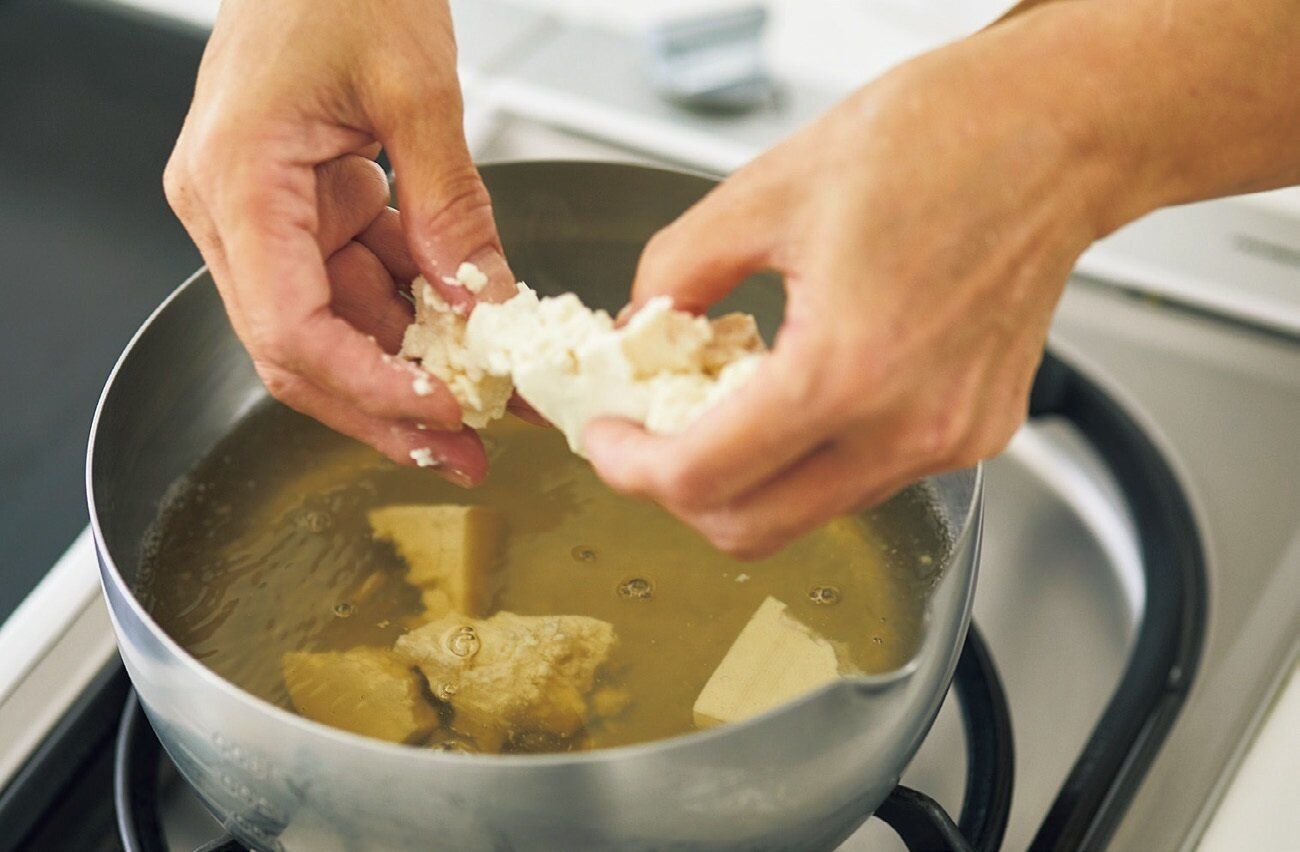 木綿豆腐は、大きめの一口大にちぎりながらイン。凹凸がある豆腐の断面がみそ汁を吸い、至高の一杯に。