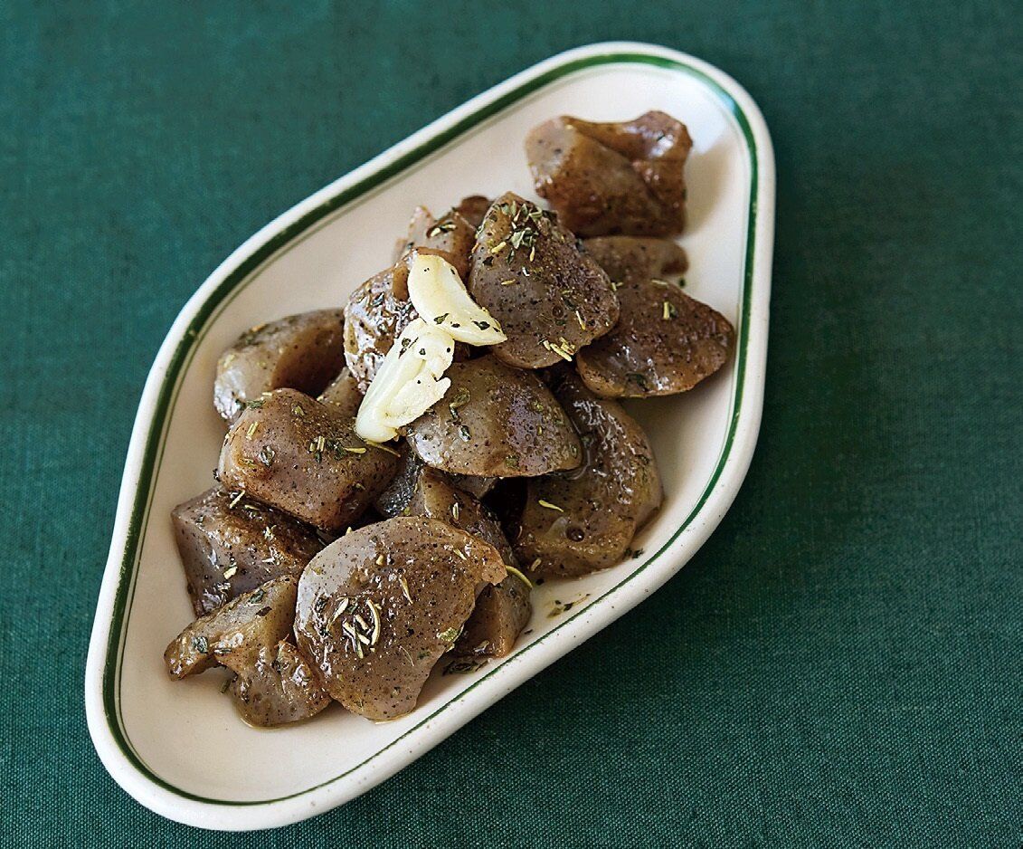 こんにゃくは沸騰した湯に入れてひと煮立ちさせ、中火で約3分ゆでる。粗熱を取り、スプーンで食べやすい大きさにちぎる。フライパンに入れて中火で熱し、表面の水けをとばしながらからいりする。軽く焼き目がついたらオリーブ油、にんにく、塩小さじ2/3を加えて炒め合わせ、ミックスハーブと黒こしょう少々を加える。