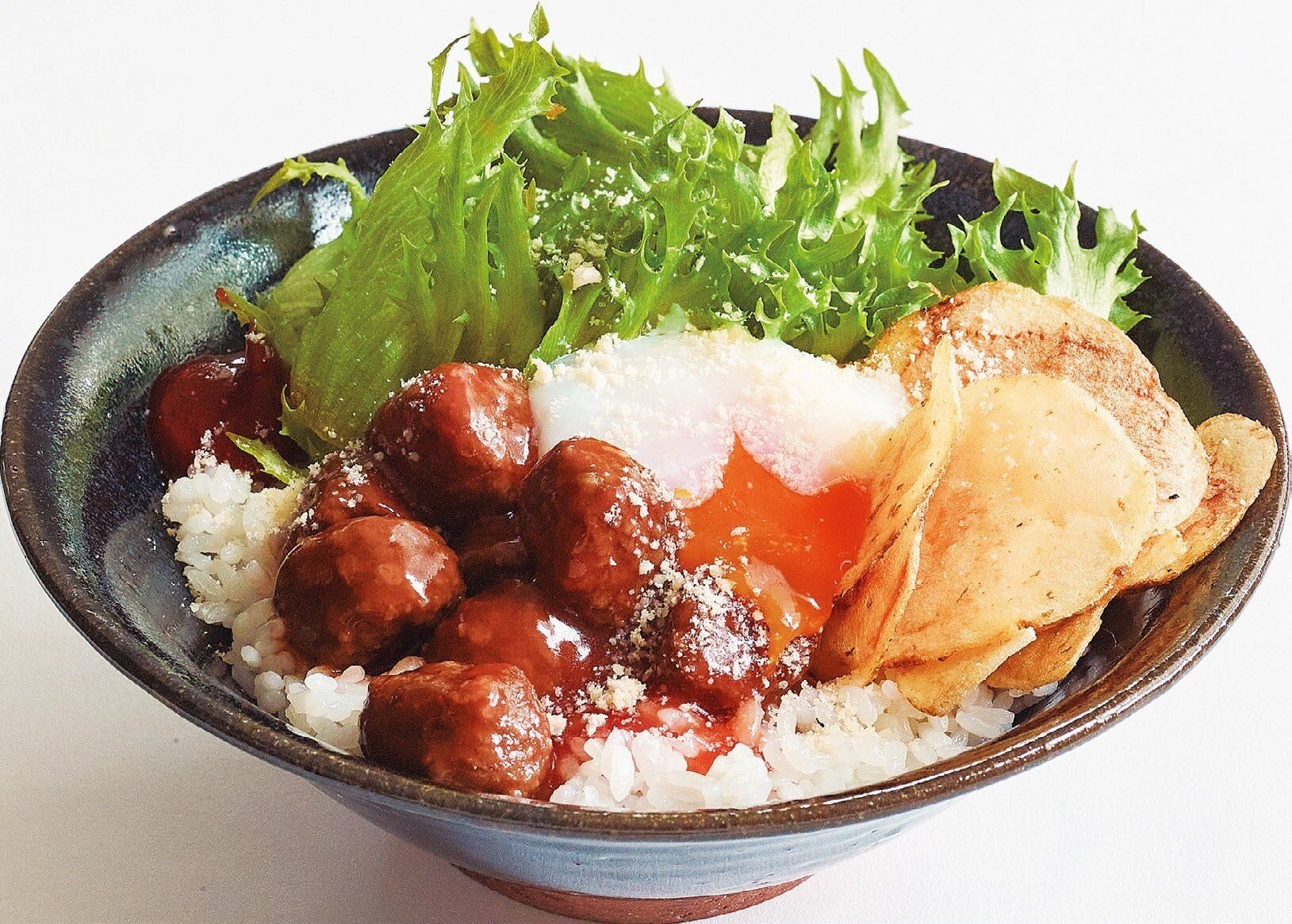 器にご飯を盛り、レタス、ミートボールをのせ、ポテトチップスを添える。温泉卵をのせ、ケチャップを絞り、粉チーズをふる。