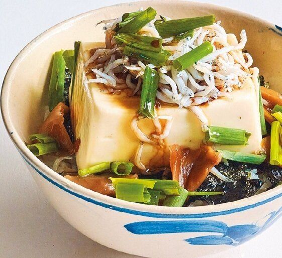 器にご飯を盛り、のりをちぎってのせる。豆腐をのせ、榨菜、しらす、万能ねぎをのせ、しょうゆ、ごま油をかける。