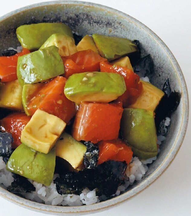 ボウルに[A]を混ぜ、サーモンをからめる。ラップを掛けて冷蔵室で10分冷やす(30分くらいなじませてもよい)。食べる直前にアボカドを混ぜる。器にご飯を盛り、のりをちぎってのせ、サーモンとアボカドの汁けを軽くきってのせる。