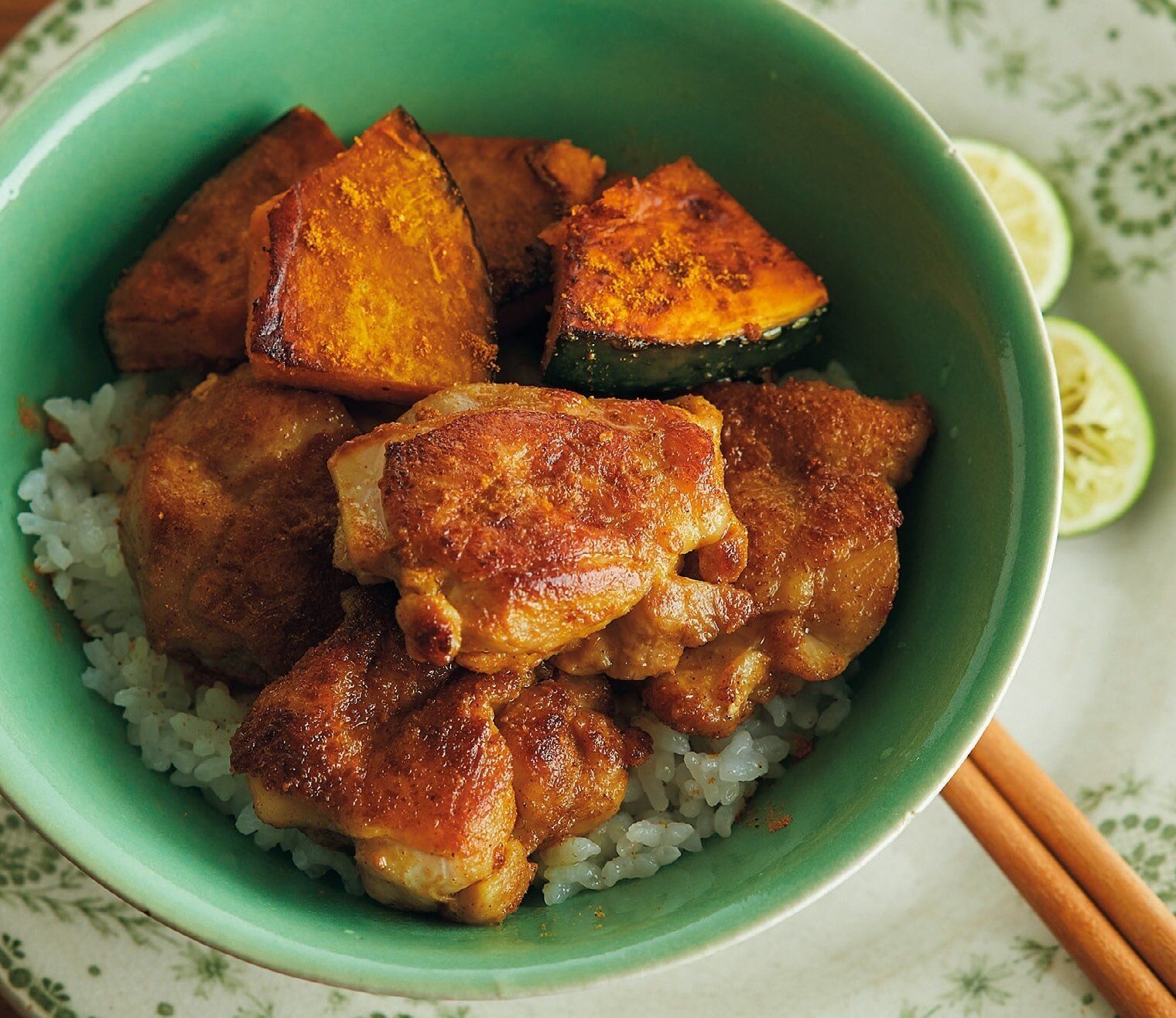 ご飯に鶏肉、かぼちゃをのせ、カレー粉をふる。すだちを添え、絞って食べる。