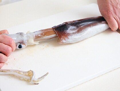 いかは目の下を持ち、わたごと足を引き抜いて軟骨とすみ袋を除く。足からわた、目を切り落とし、くちばしを除き、胴は洗って水けを拭く。足は吸盤をしごいて洗い、先のほうを切り落とす。