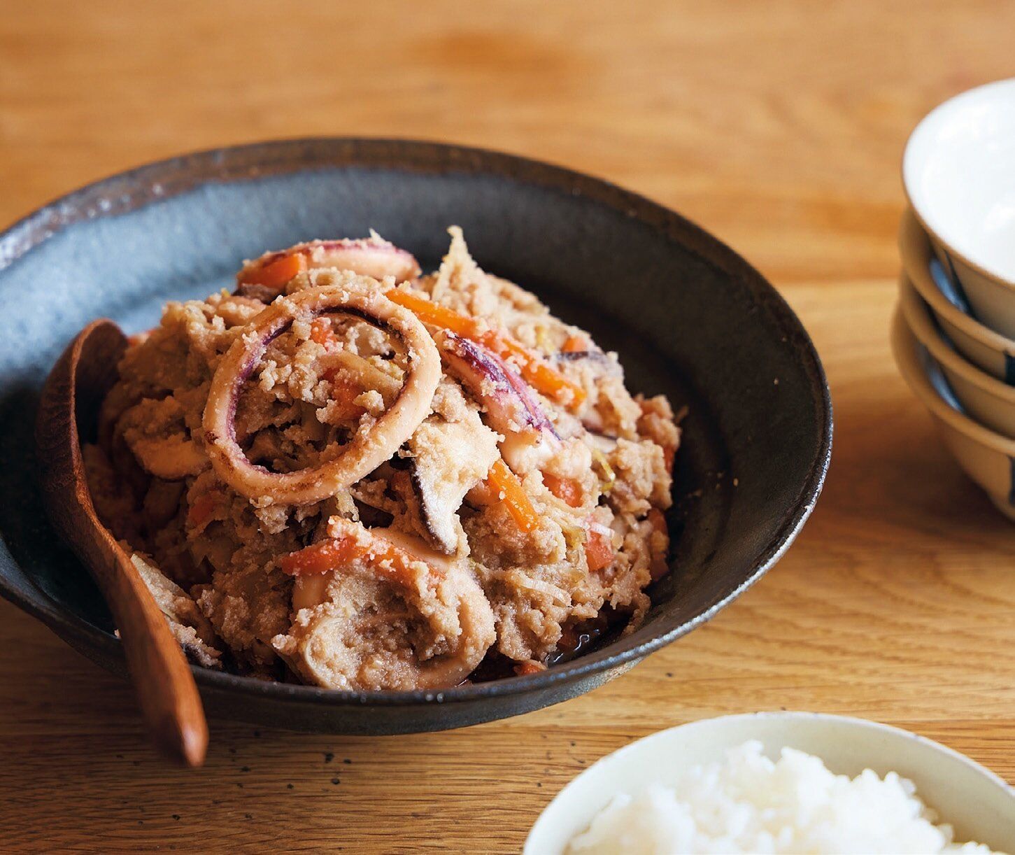 (3)おからを加えて炒め、具となじんだら[A]を加える。時々混ぜながら、煮汁がとぶまで約8分煮る。