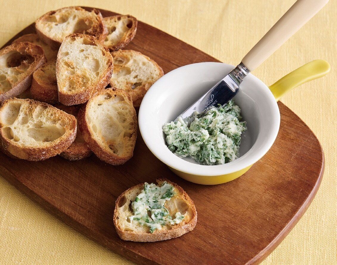 柔らかくなったバターに青じそ、おろしにんにく、塩を混ぜる。バゲットを厚さ7~8mmに切ってトーストし、青じそバターを塗りながら食べる。