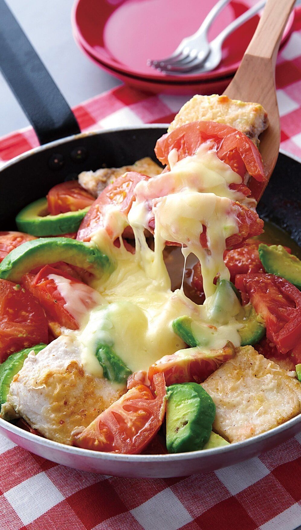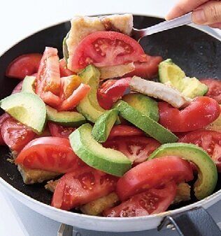 (2)にトマト、アボカドを加えて塩小さじ1/3をふり、ざっくりと混ぜる。中央にピザ用チーズをのせ、ふたをして、チーズが溶けるまで弱火で2~3分蒸し焼きにする。