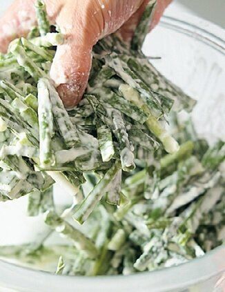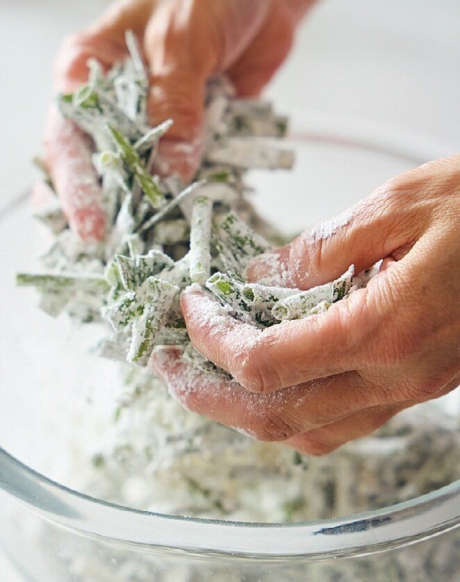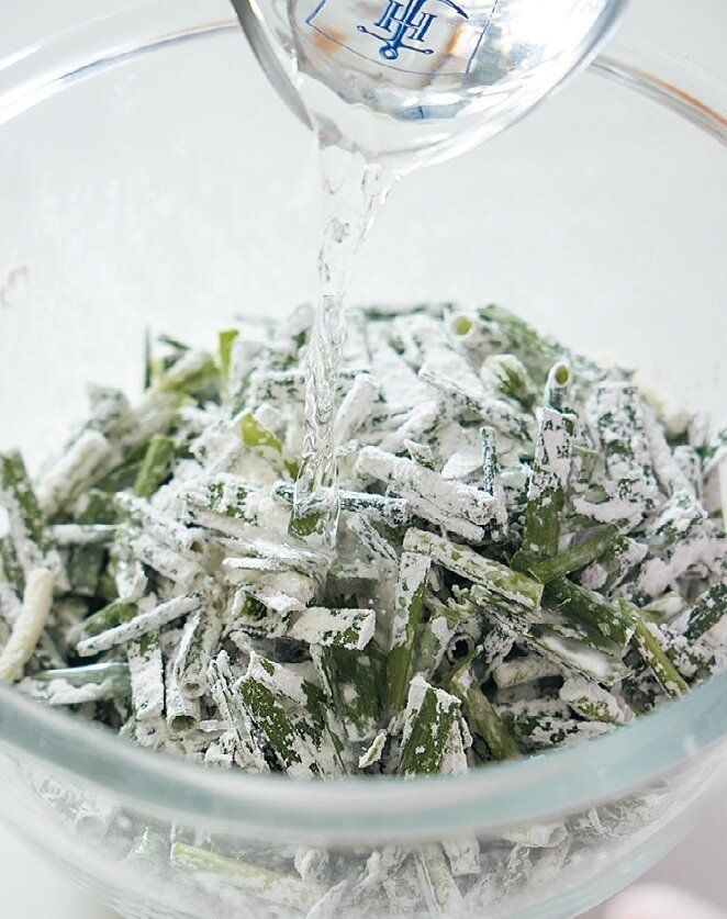 さっと洗ったにら、万能ねぎを、水けを拭かずにボウルに入れ、薄力粉、塩を加えて手でふんわりと混ぜて粉を全体にまぶす。