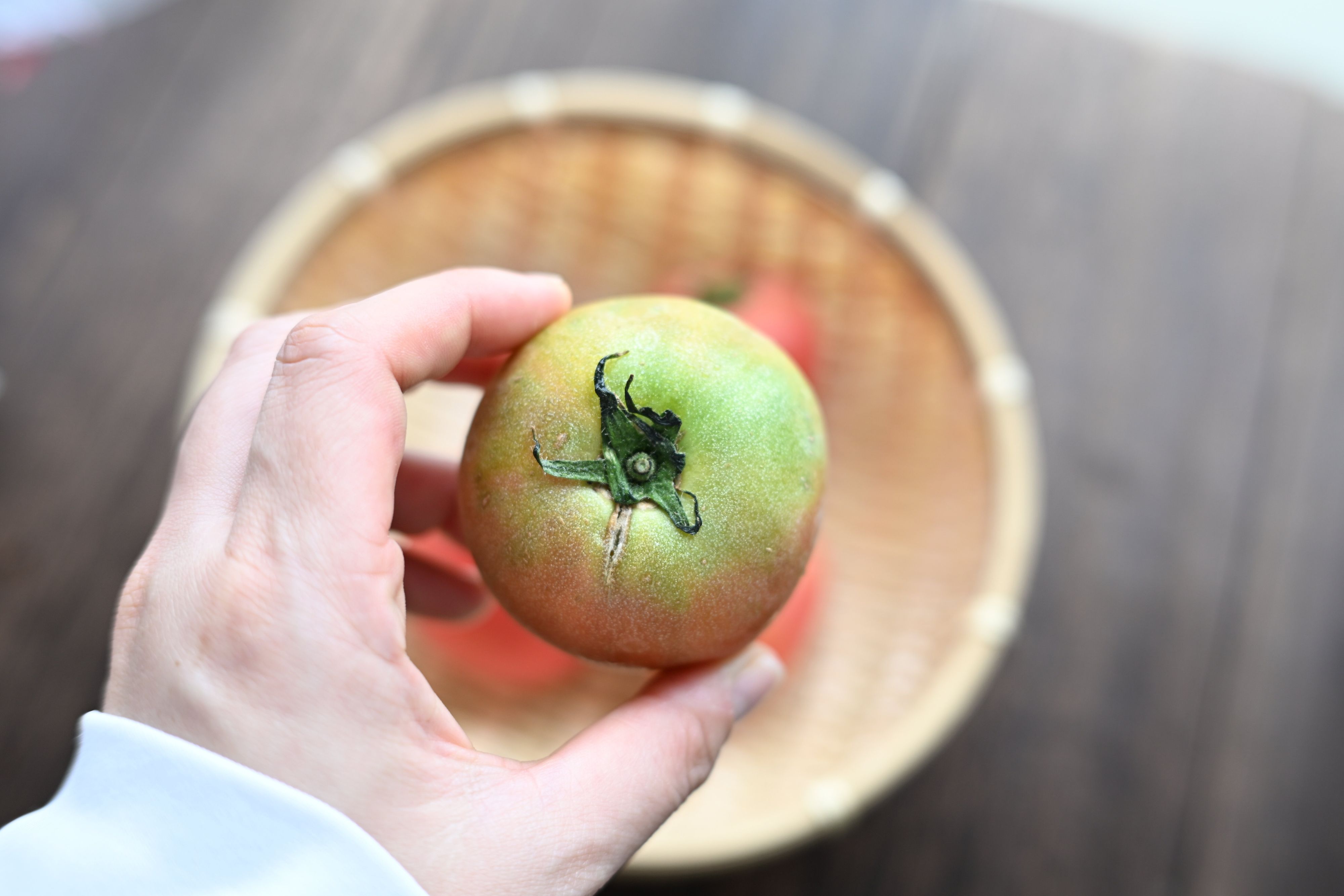 まず、赤いトマトは野菜室にしまって、緑色のトマトは常温保存できるようかごに入れてキッチンに置いておきました。緑色のトマトを触った感じは固くて、見た目からそのままだとおいしく食べられそうなものでありません。