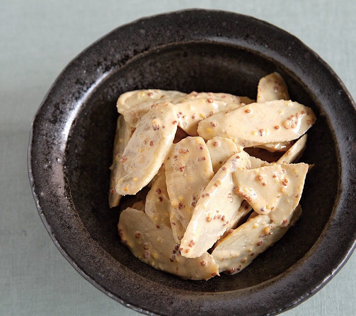ごぼうは幅5mmの斜め切りにして耐熱皿に広げてのせ、ふんわりとラップを掛け、電子レンジで3分加熱し、電子レンジの庫内にそのまま5分おく。ざるに上げて水けをきってボウルに入れ、[A]を加えてあえる。