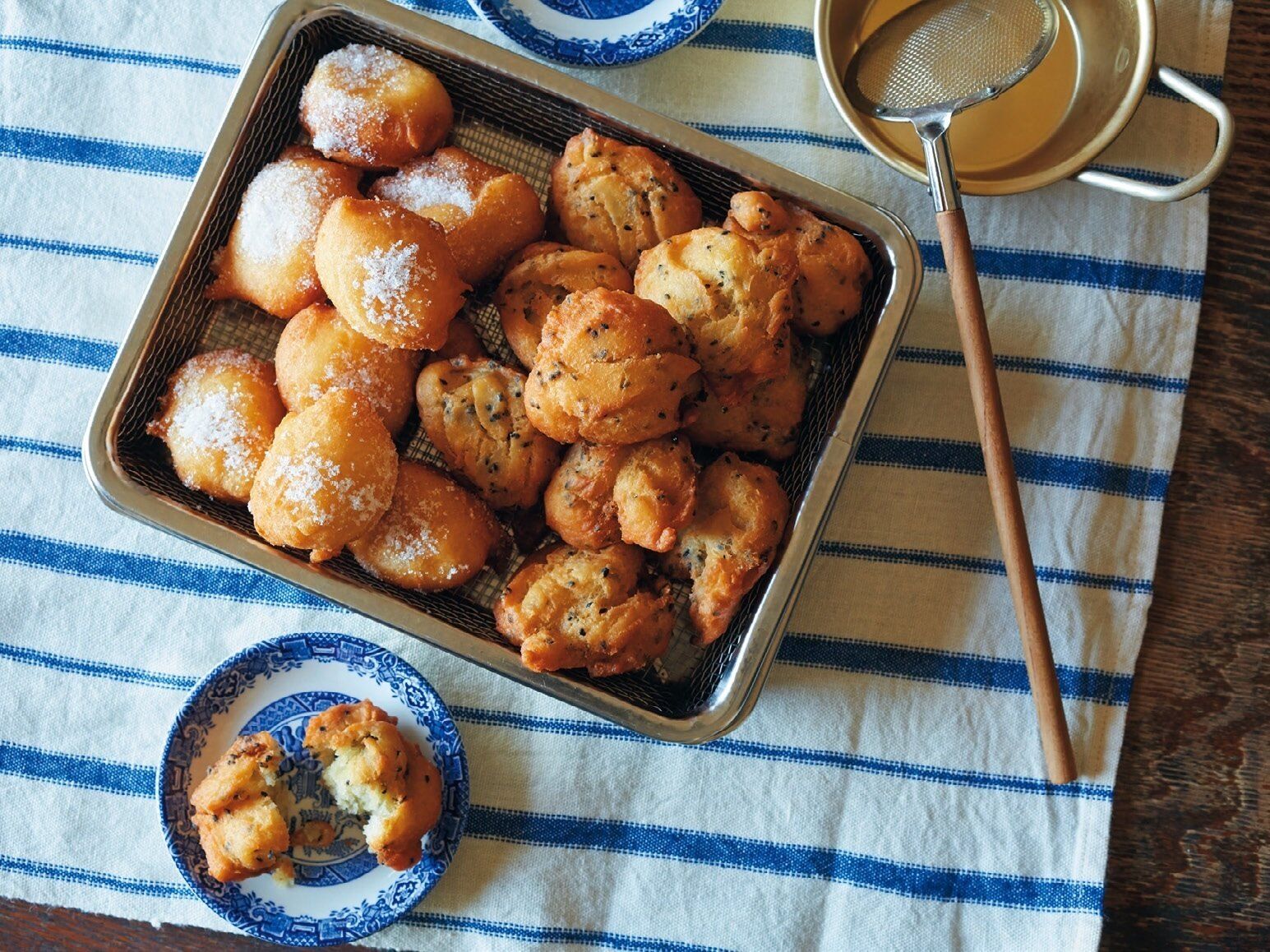 (3)フライパンに揚げ油を深さ2cm入れて低温(150℃)に熱する。カレースプーンを揚げ油にくぐらせ、(2)の半量を小さめの一口大にすくって全部で約12個入れる。返しながら5~6分こんがりと揚げ、油をきってグラニュー糖をまぶす。