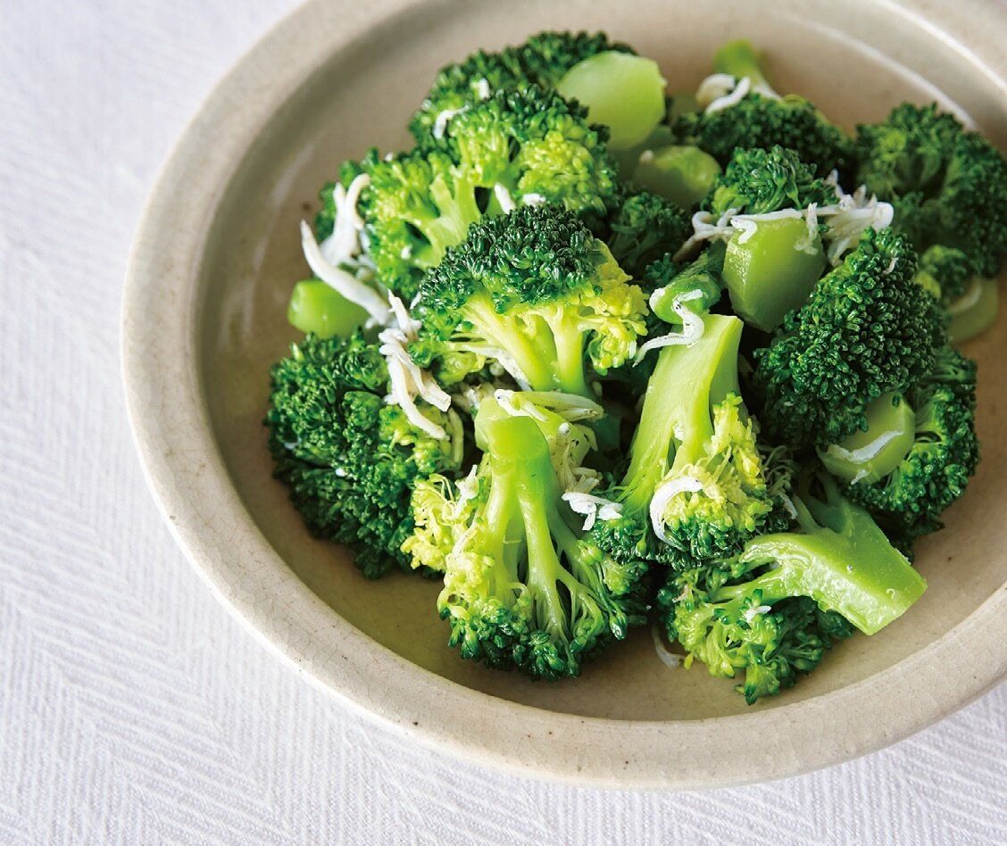 ブロッコリーは小房に分け、茎は皮を厚めにむいて厚さ5mmの輪切りにする。耐熱皿に広げ入れ、塩小さじ1/4強をふり、しらすを散らして水大さじ5を回し入れる。ふんわりとラップを掛け、電子レンジで約4分加熱する。水けをきり、オリーブ油を回し入れてあえる。