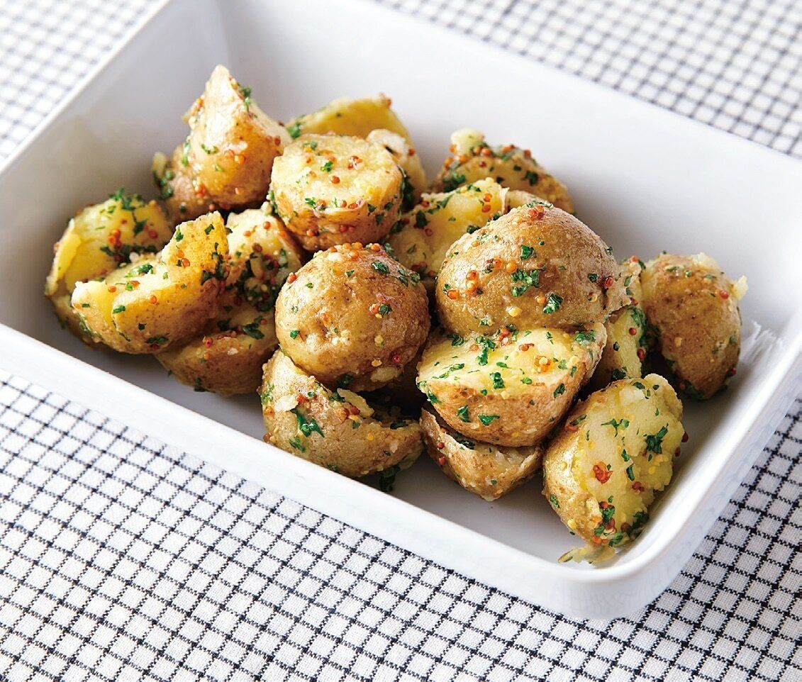 じゃがいもはよく洗い、水けがついたまま耐熱皿の周囲に並べる。ふんわりとラップを掛け、電子レンジで約7分30秒加熱する。水けをきってフォークで半分に割る。ボウルに[A]を混ぜ、じゃがいも、パセリを加えてあえ、なじませる。
